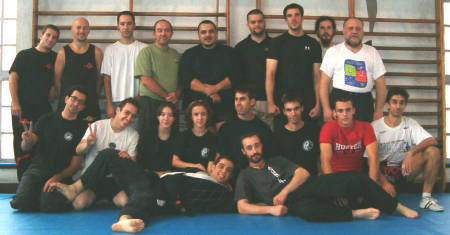 Nos mostró una parte de su trabajo de grappling, agarres y derribos para buscar la posición ventajosa, con estrangulación y luxaciones más corrientes, montada, pase de guardia, ... . Nos dijo que estos ejercicios servirían de calentamiento y parecía sencillo, pero nos hizo sudar bastante. Creó mucha expectación y fue muy divertido. Un buen comunicador y un buen comienzo.