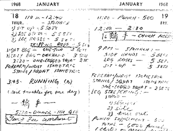 Entrenos como los precedentes eran normales en los diarios de Bruce Lee y le enseñaron mucho sobre las potencialidades de su cuerpo físico. Escribiendo estos horarios en su diario, Bruce era capaz de hacer inventario de su continuo viaje en las artes disciplinarias, cuyo destino era el desarrollo de su persona en los tres niveles, físico, mental y espiritual. Cada nivel que conseguía superar le servia no solo como limite sino como trampolín desde el que empujarse hacia cotas mas elevadas. Cada entreno grabado en su diario servia como prueba de archivo del nivel en que estaba en ese momento para poder ser superado en el futuro. Como el mismo decía: