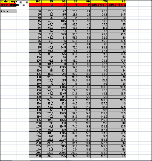 Te dejo una tabla de repeticiones máximas en función de tu 1RM (varía de persona a persona, así que tampoco te la tomes demasiado en serio, pero está bien para hacerse una idea)